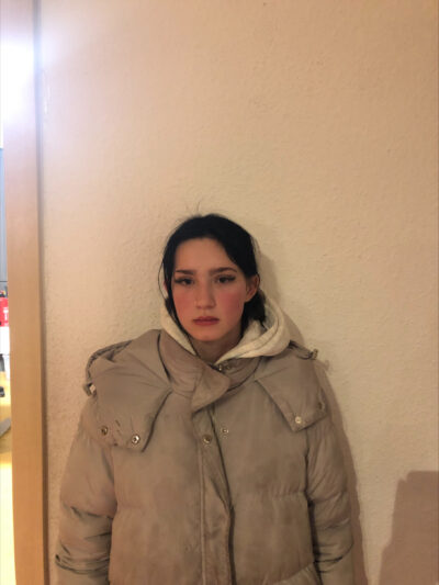 - bekleidet mit schwarzem Hoodie, schwarzer Jogginghose mit weißen Streifen (Adidas) und weißen Schuhen (Nike)