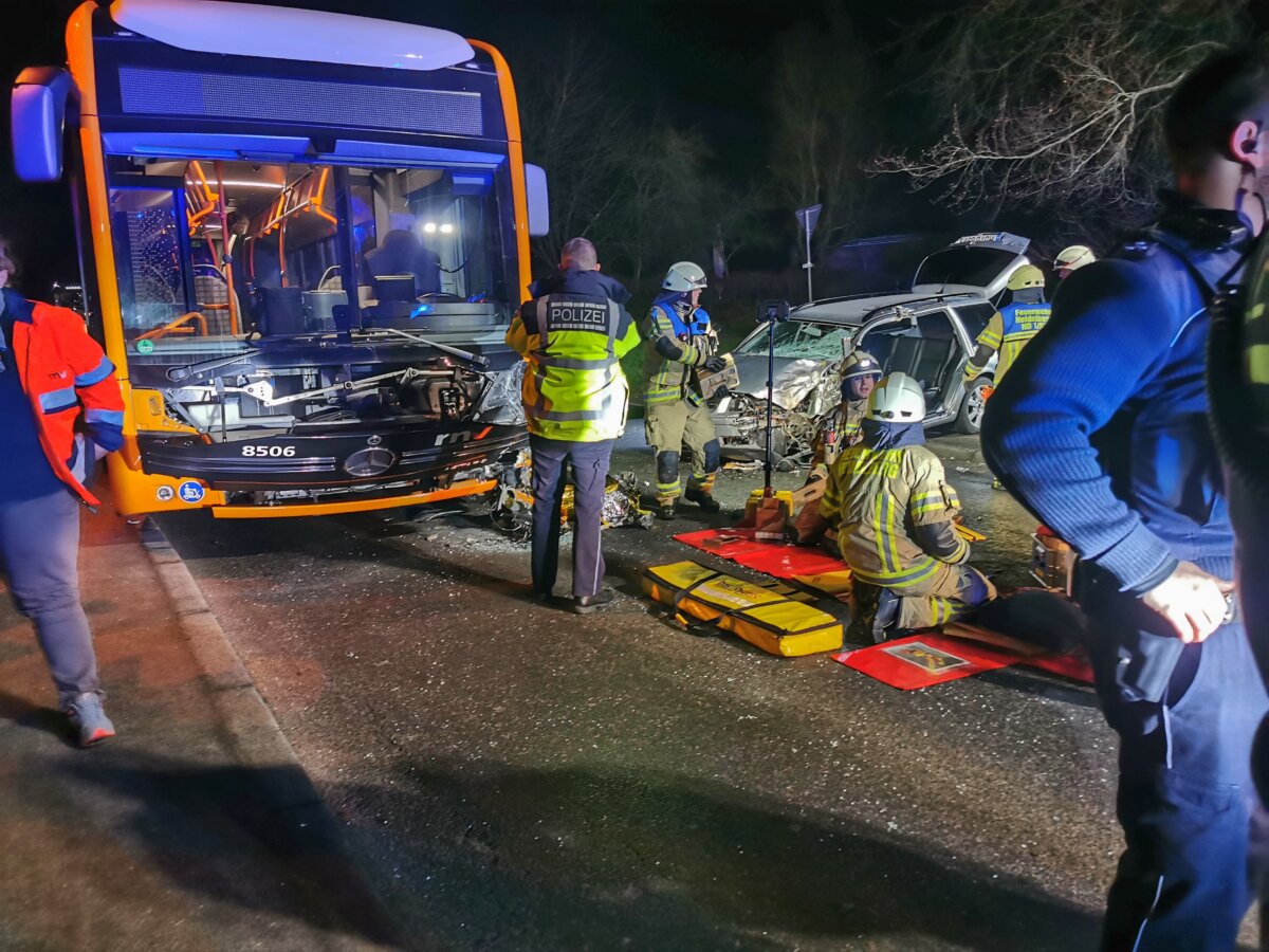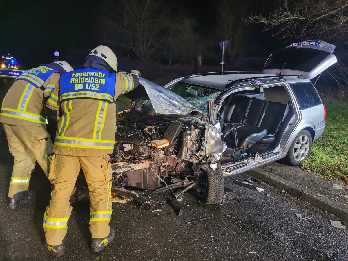 Heidelberg-Boxberg (ots) – Die 42-jährige Fahrzeugführerin eines VW Bora befuhr gegen 22.00 Uhr die Straße „Am Götzenberg“ in Richtung Heidelberg-Boxberg. Aus bislang unbekannter Ursache kam sie in einer Rechtskurve zur weit auf die Gegenfahrbahn, wo sie frontal mit einem ihr entgegenkommenden Linienbus kollidierte. Der Pkw wurde daraufhin abgewiesen und kam in einem angrenzenden Grünstreifen zum Stillstand. Der VW Bora wurde an seiner Fahrzeugfront derart stark deformiert, dass die 42-Jährige darin eingeklemmt wurde. Durch die Berufsfeuerwehr Heidelberg, welche mit insgesamt 14 Einsatzkräften vor Ort war, konnte sie schließlich aus ihrem Auto befreit werden. Im Anschluss daran wurde sie schwer verletzt in ein umliegendes Krankenhaus verbracht. Der Linienbus wurde durch den Busfahrer, welcher die Situation frühzeitig erkannte, noch vor dem Zusammenstoß fast bis zum Stillstand abgebremst, wodurch vermutlich Schlimmeres vermieden werden konnte.