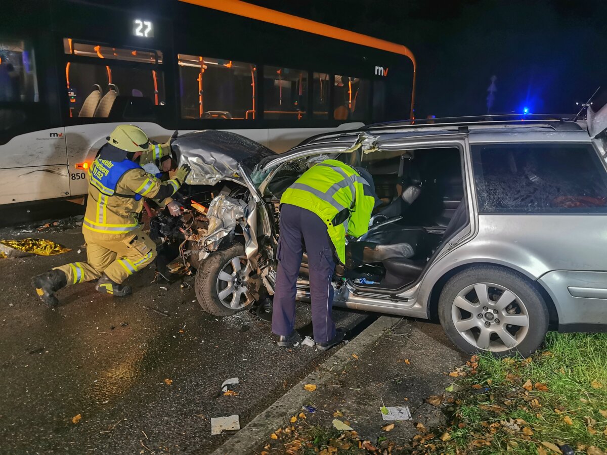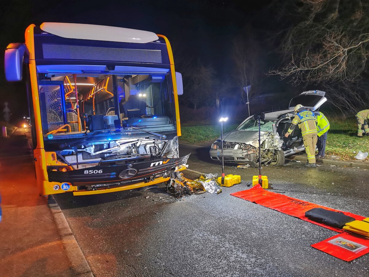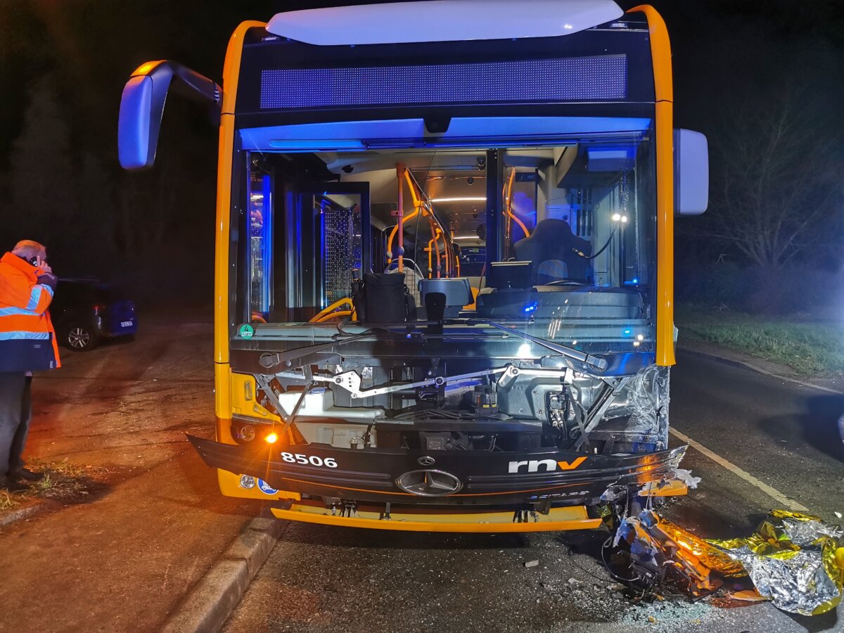 Im Bus selbst befanden sich neben dem Fahrzeugführer lediglich noch zwei weitere Fahrgäste, welche die Unfallörtlichkeit augenscheinlich unverletzt noch vor dem Eintreffen der ersten Rettungskräfte verlassen hatten. Der Busfahrer blieb ebenfalls unverletzt. Der Linienbus war trotz der Kollision noch fahrbereit und konnte seinen Weg auf eigener Achse bis zum RNV Betriebshof fortsetzen. An dem VW Bora, welcher abgeschleppt werden musste, entstand Sachschaden in Höhe von ca. 5.000 Euro. An dem Bus entstand ein Schaden von ca. 20.000 Euro.