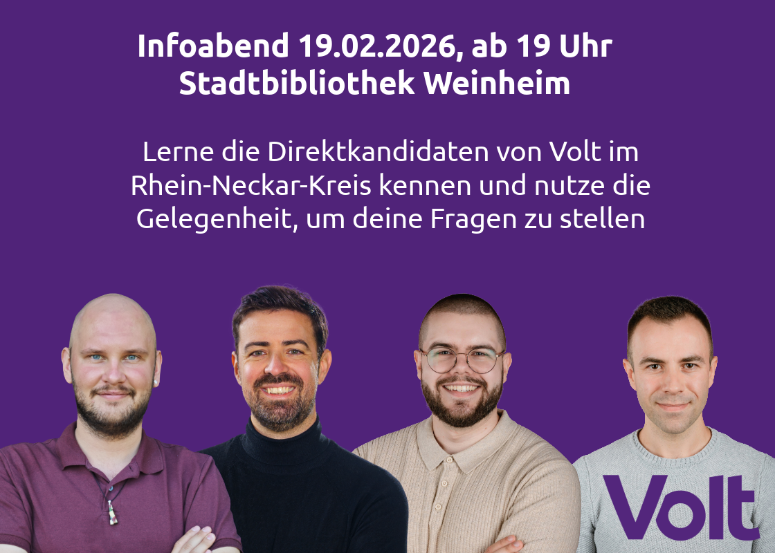 Die Rhein-Neckar-Kreis-Direktkandidaten der Partei Volt laden am Donnerstag, 19. Februar 2026, ab 19 Uhr zu einem Informationsabend in den Saal der Stadtbibliothek Weinheim ein.